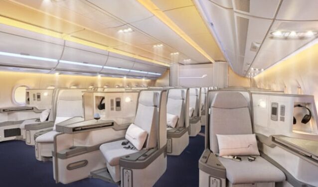 El Airbus A350-1000 tiene una capacidad de 350 a 410 pasajeros en una configuración de tres clases. El A350-1000 ofrece a los pasajeros la cabina de doble pasillo más silenciosa del cielo. Los asientos son amplios, con iluminación LED que minimiza los efectos del jet lag.